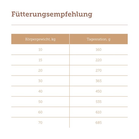 De aanbevolen hoeveelheden vermeld op de verpakking zijn richtwaarden per dag, die afhankelijk van externe invloeden en aanleg van de hond moeten worden aangepast.
