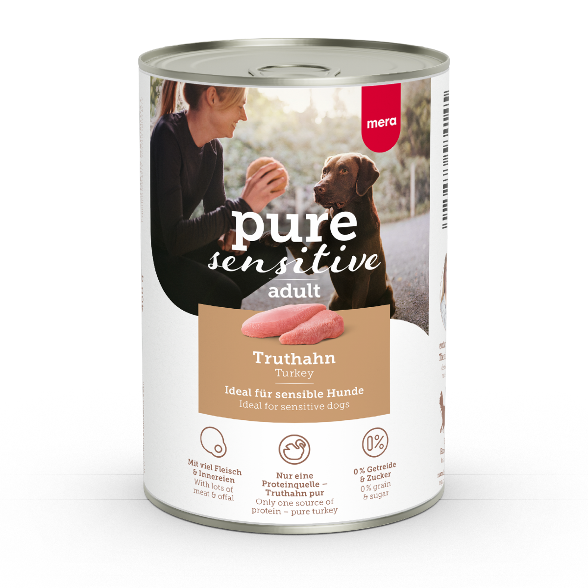 Mera PURE  SENSITIVE natvoer is speciaal ontwikkeld voor honden met voedingsproblemen zoals gevoelige darmen of met een voeding gerelateerde allergie. Deze bijzonder smaakvolle voeding voor volwassen honden is 100% granenvrij en kan worden gebruikt als volledige voeding of om te mengen met andere voeding.
